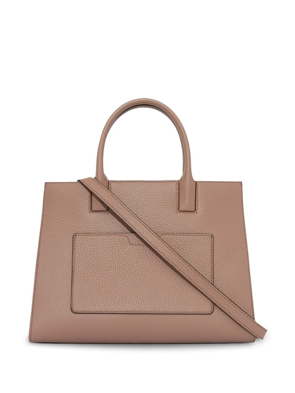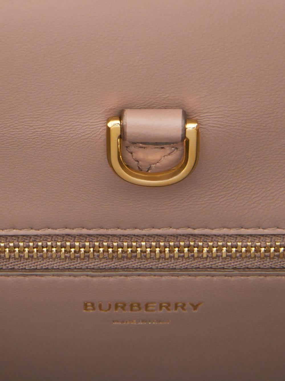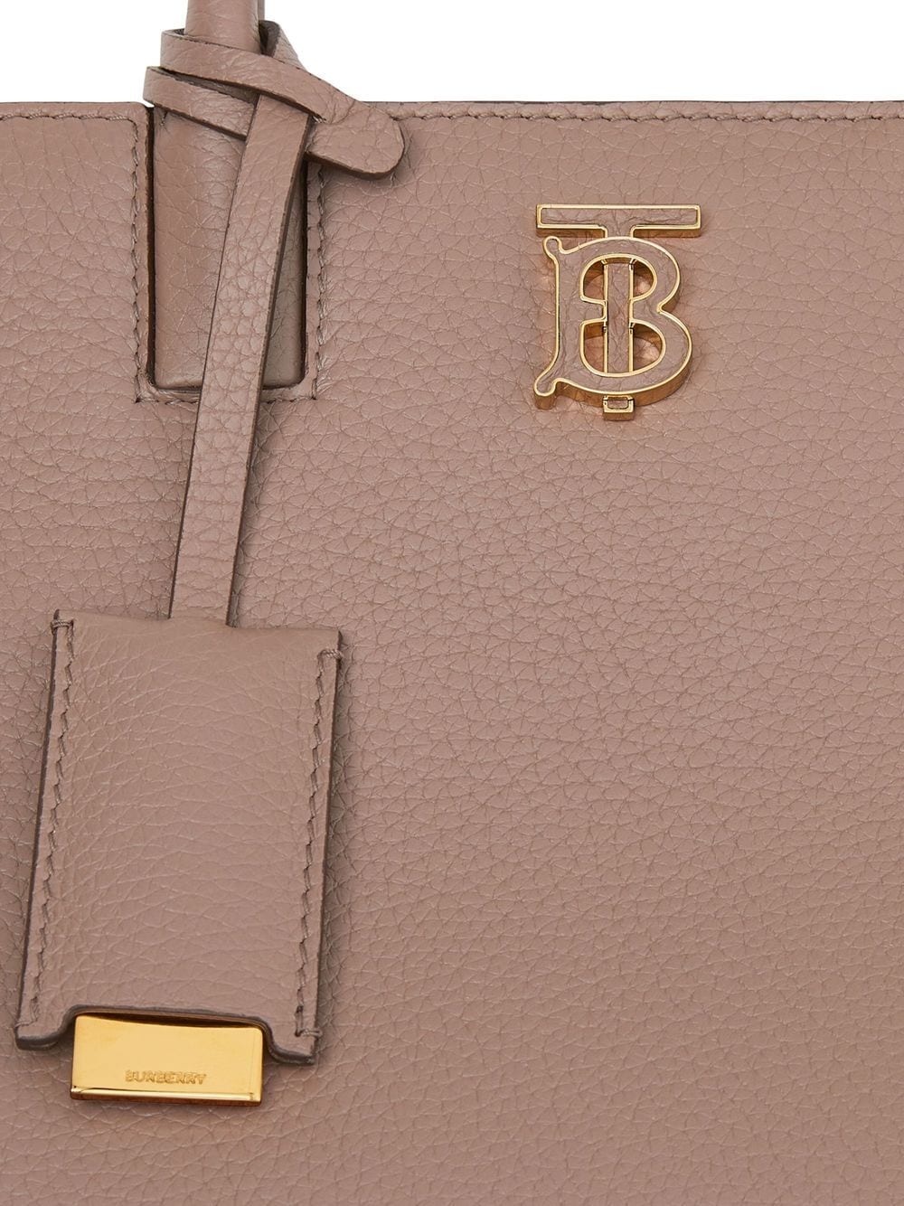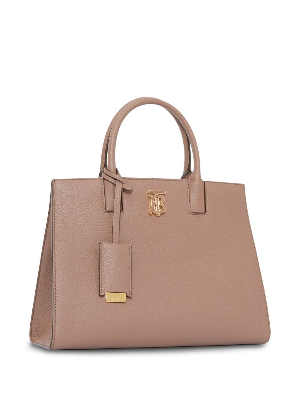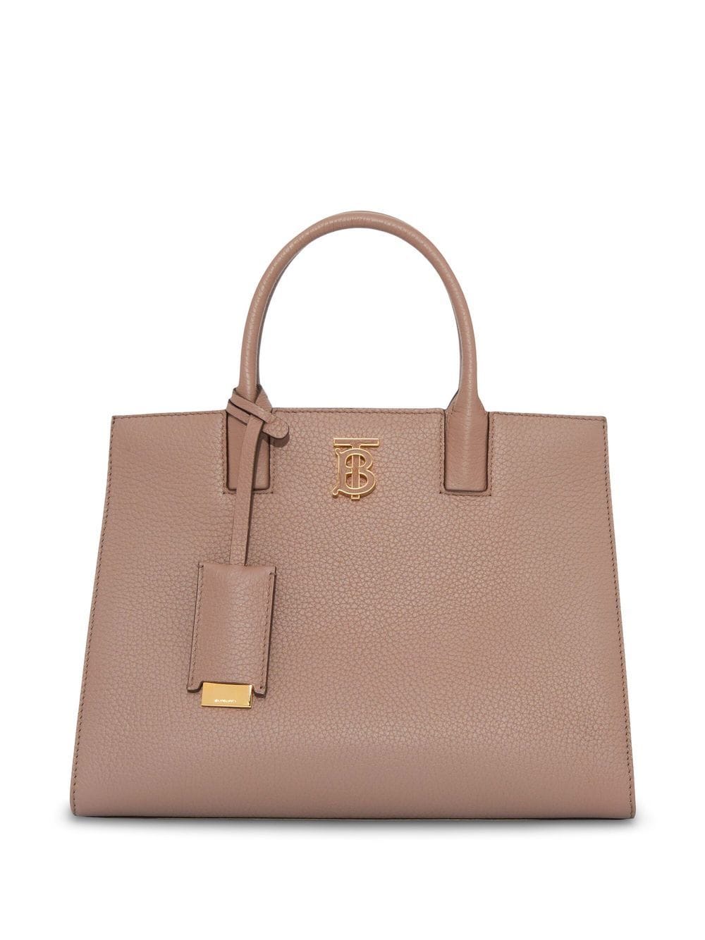 Frances mini leather tote bag from BURBERRY featuring leather, gold-tone logo plaque, two rounded top handles, adjustable detachable shoulder strap, main compartment, internal slip pocket, internal zip pocket and light saddle brown.