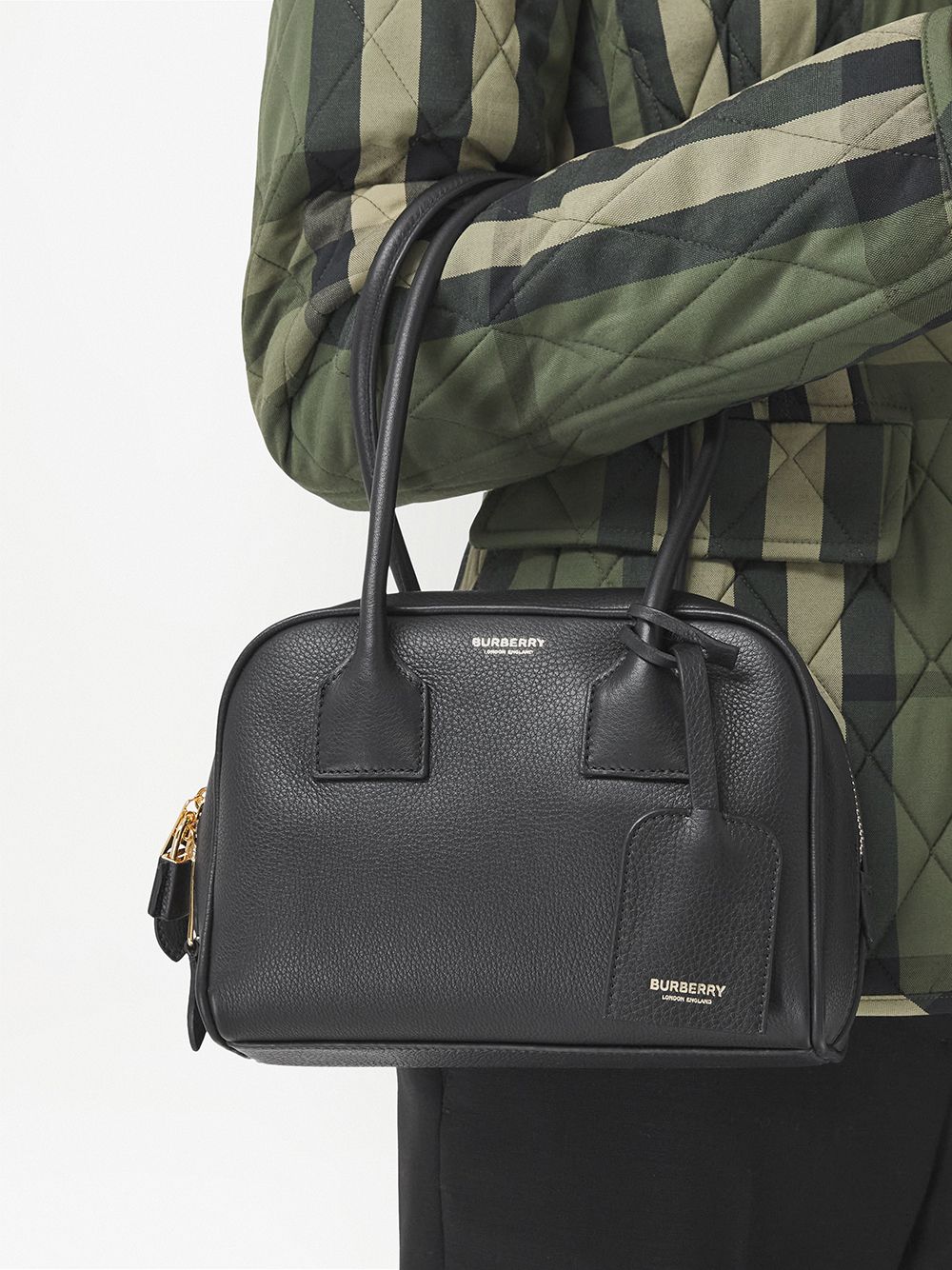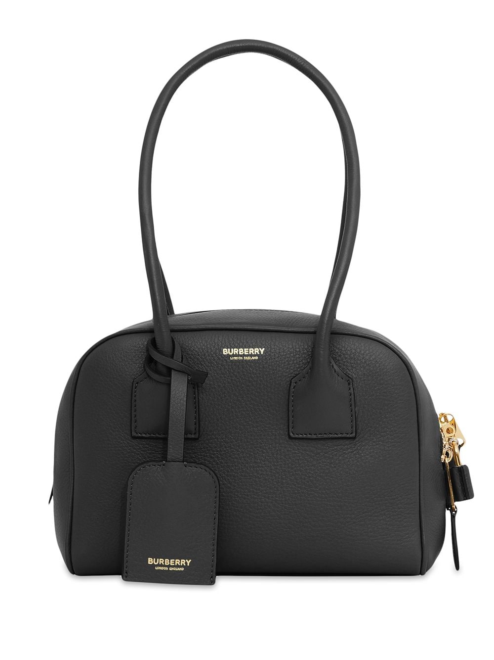 This mini Half Cube bag is a miniature version of Burberry’s runway bowling bag, crafted from grainy Italian-tanned calf leather and embossed with a gold-tone logo. The compact, structured style is finished with rolled leather top handles.