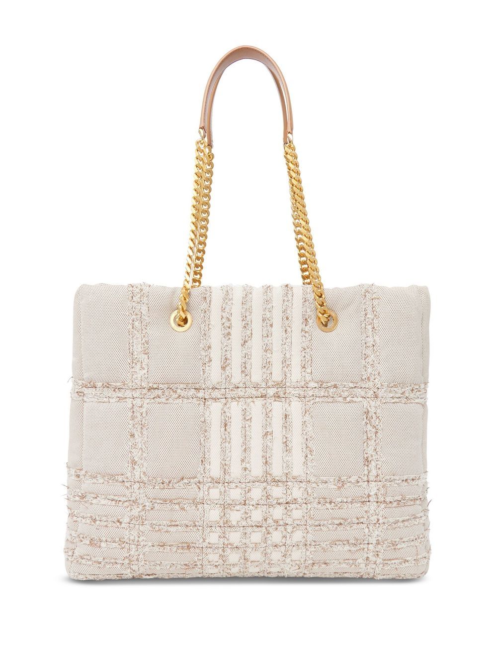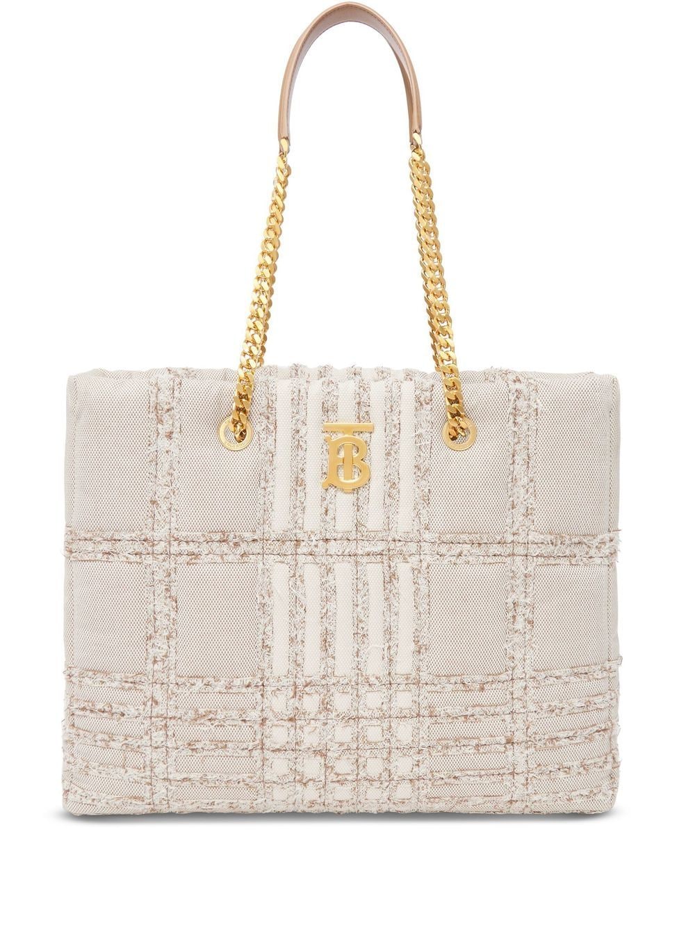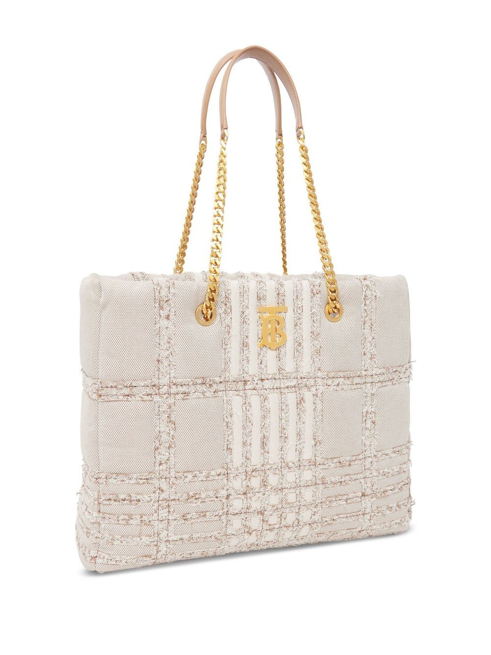 Key brand details come together on this Lola bag from Burberry, creating an instantly recognisable design. In soft beige and cream hues, a subtle checked pattern is complemented by a polished gold-tone logo plaque.