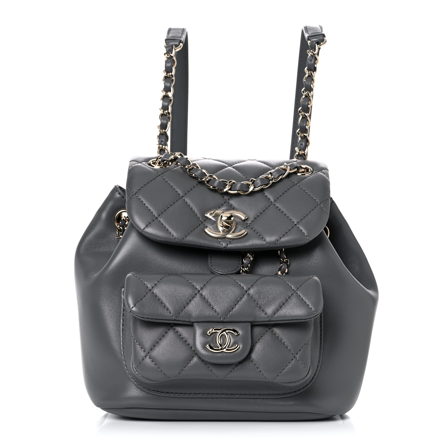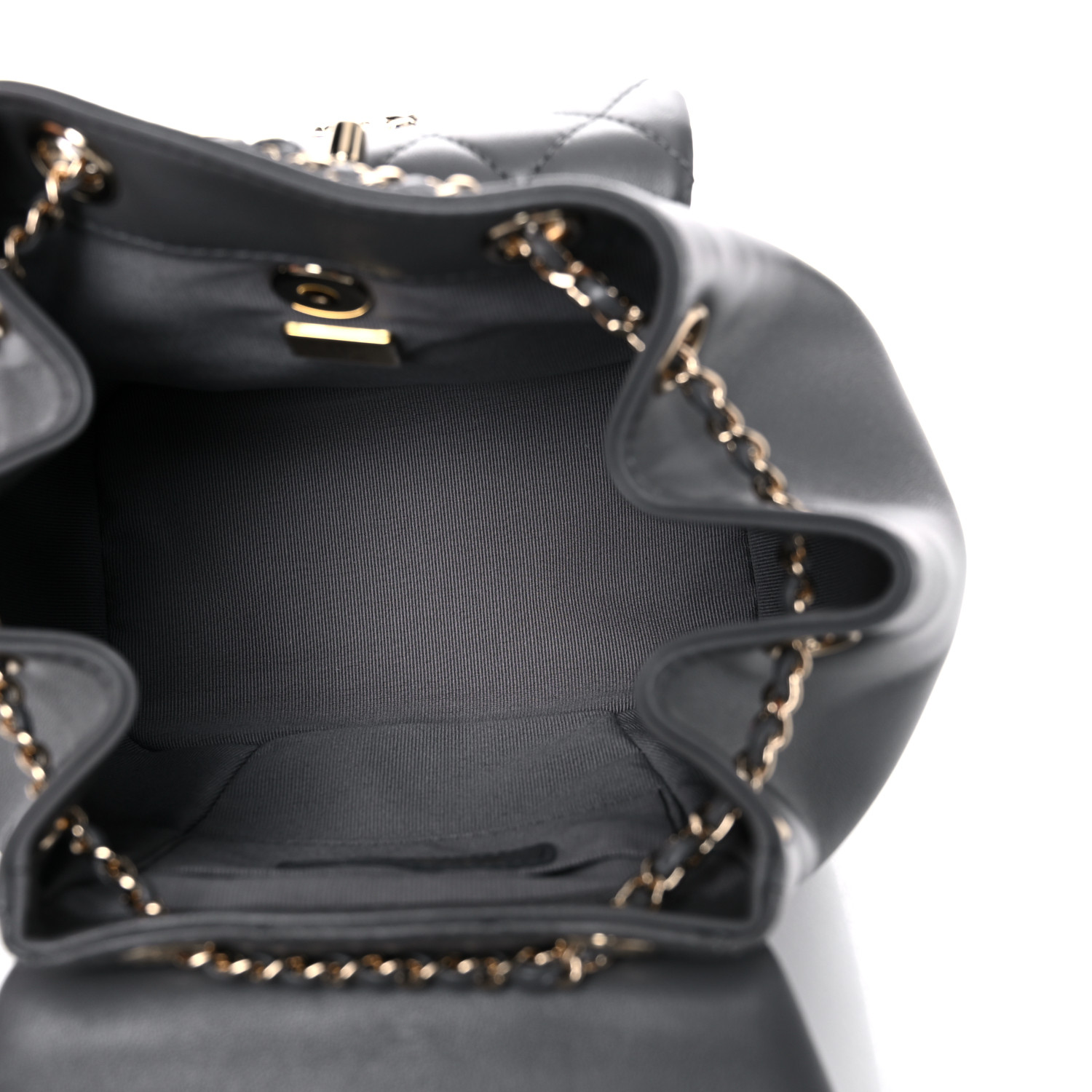 This is an authentic CHANEL Lambskin Quilted Small Duma Drawstring Backpack in Grey. This stylish backpack is beautifully crafted of lambskin leather in grey. The backpack features polished light gold chain link leather threaded shoulder straps and matching cinch cord, a facing flap pocket, and a crossover flap that opens with a polished gold Chanel CC turn lock to a grey fabric interior with a patch pocket.