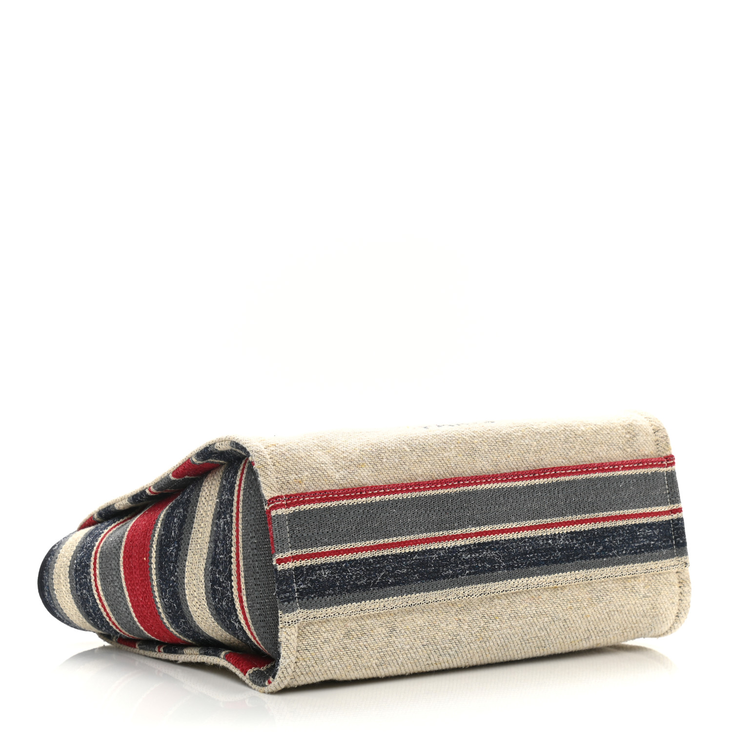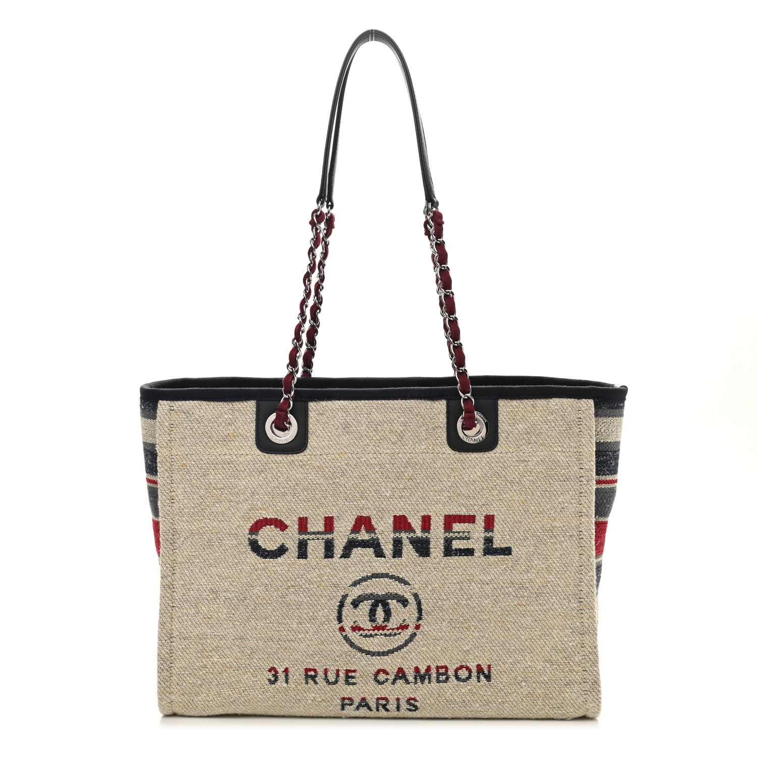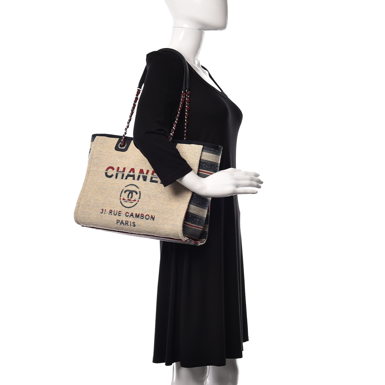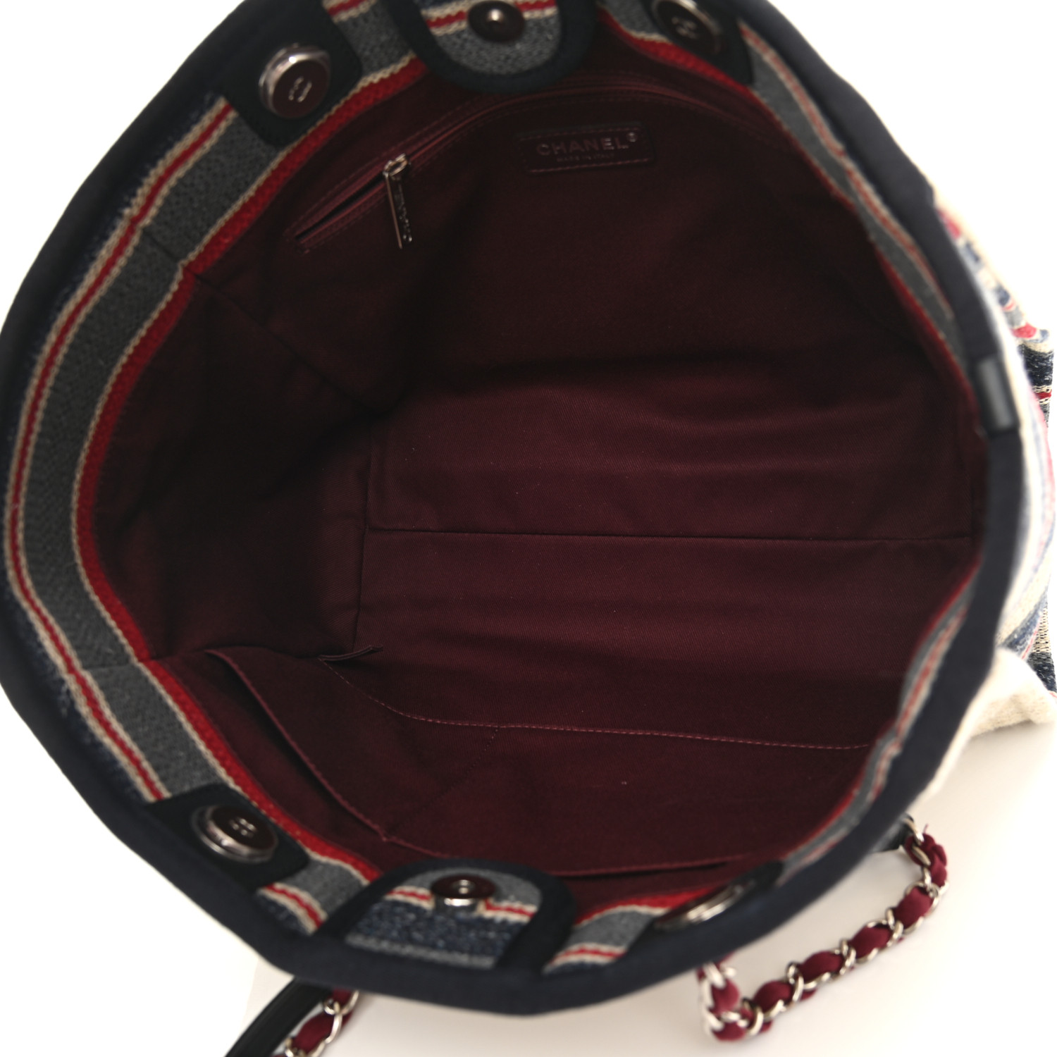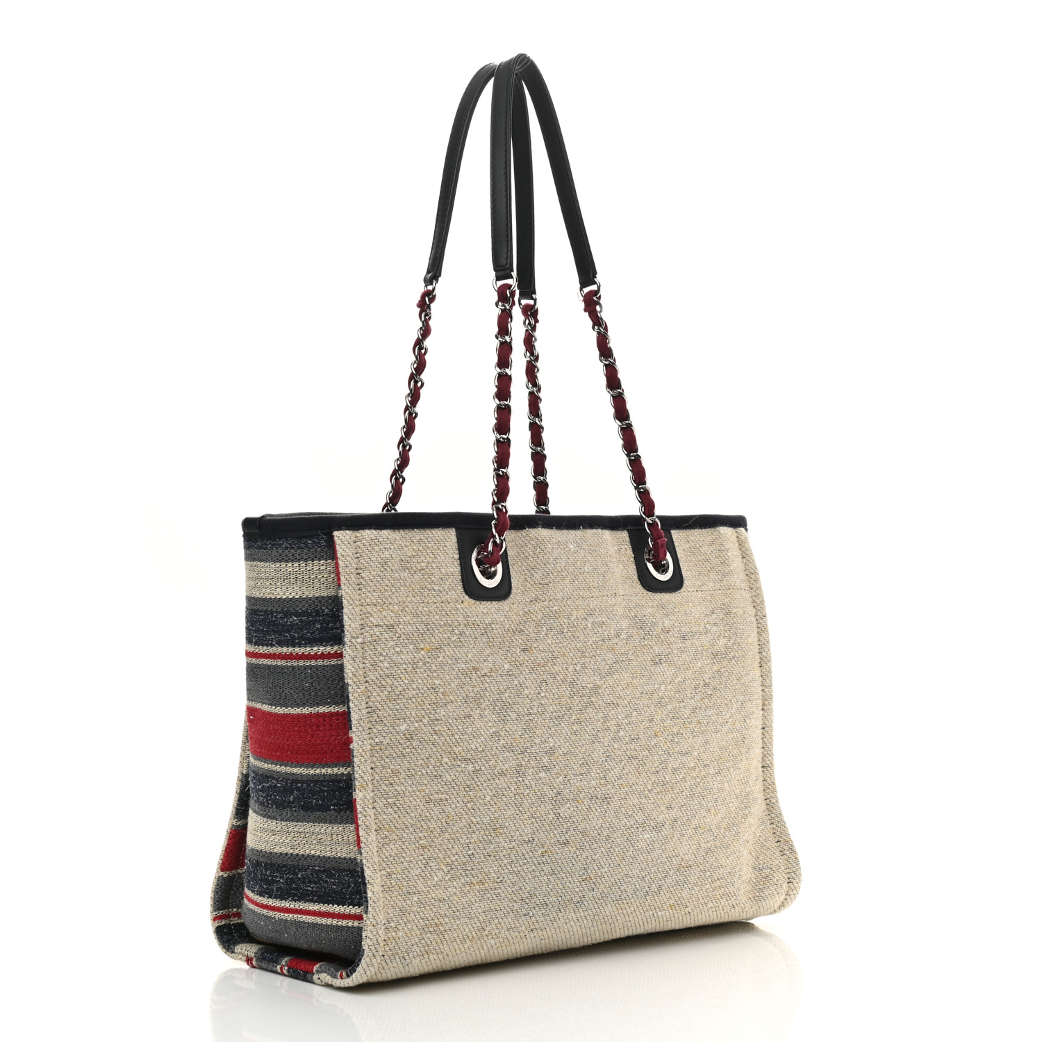 This is an authentic CHANEL Striped Canvas Small Deauville Tote in Beige. This lovely tote is crafted of a beige solid and multicolored striped canvas with a Chanel advertisement logo. The shoulder bag features polished silver chain link fabric threaded shoulder straps. The broad top opens to a burgundy fabric interior with zipper and patch pockets.