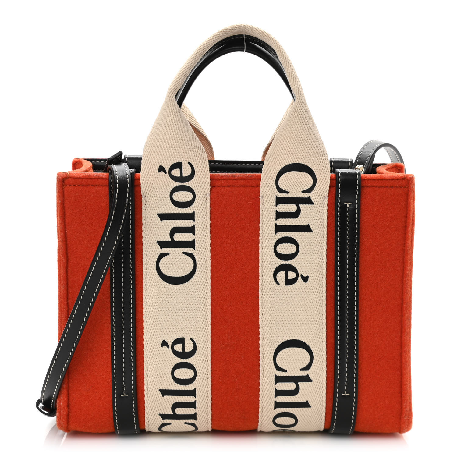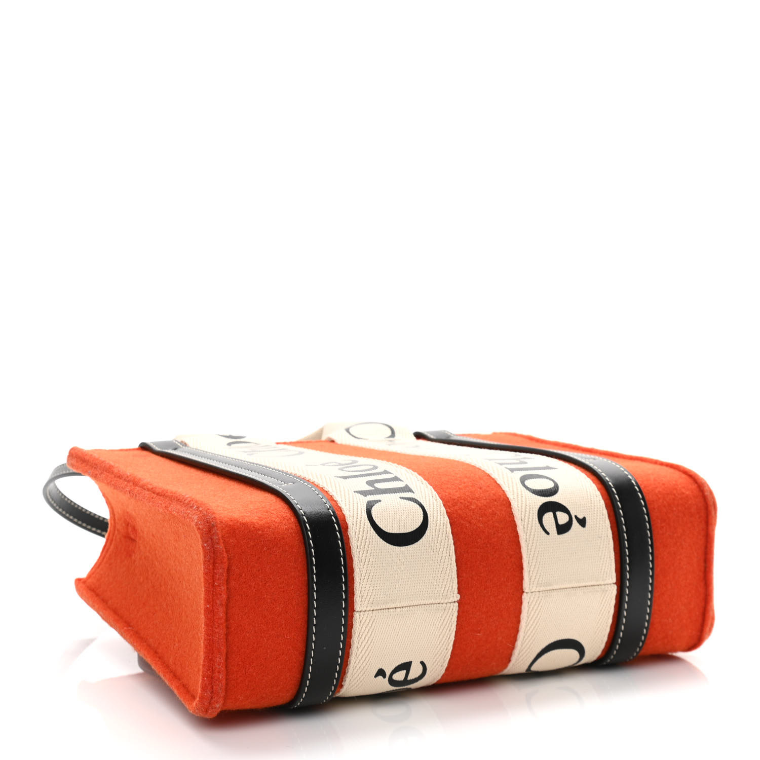 This is an authentic CHLOE Felt Calfskin Small Woody Ribbon Tote With Strap in Orange. This stylish tote is crafted of orange felt, with black leather trim. It features canvas top handles and the top opens to an orange felt interior with a pocket.