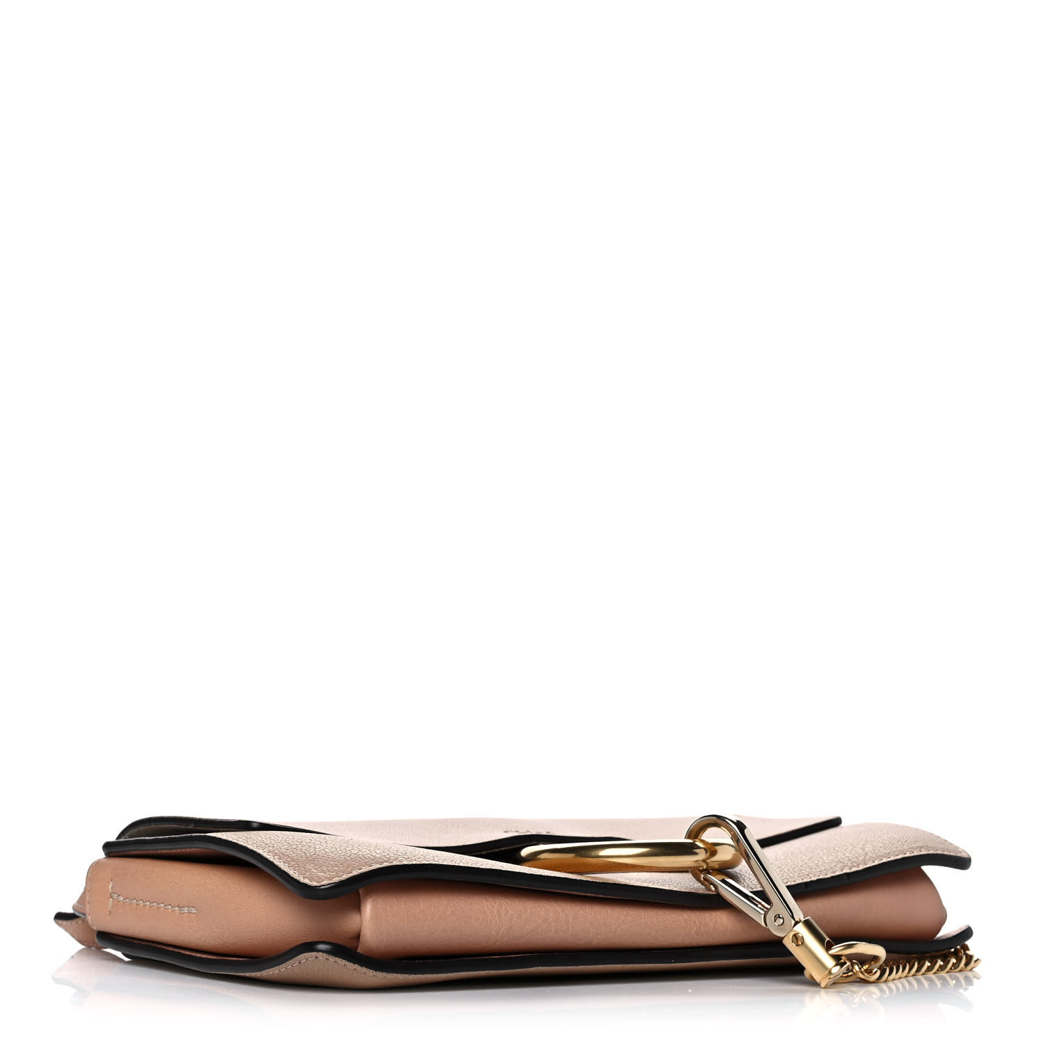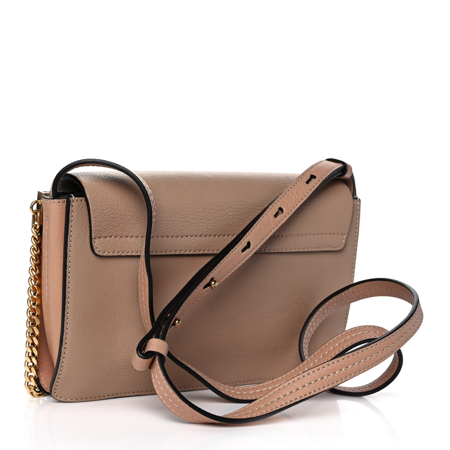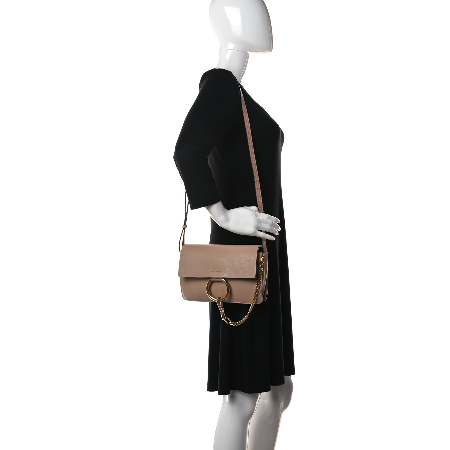 This is an authentic CHLOE Goatskin Small Faye Shoulder Bag in Biscotti Beige. This stylish shoulder bag is crafted of fine smooth goatskin leather in beige. This bag features an adjustable leather shoulder strap, a crossover flap, and polished silver and gold hardware including a decorative ring attached to a clasp and chain. The flap opens with a button snap to a partitioned beige suede leather interior with a hanging patch pocket.