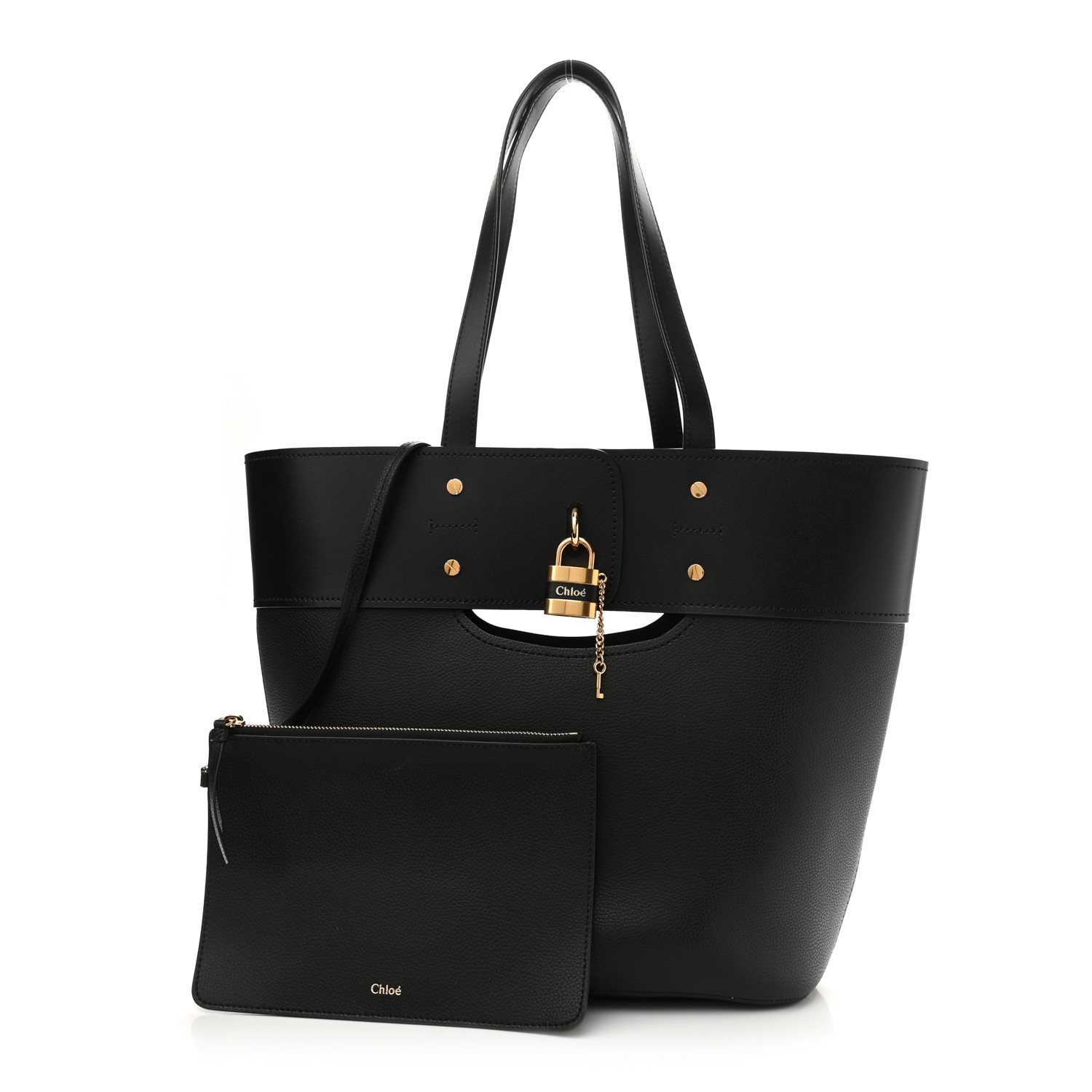 This is an authentic CHLOE Smooth Grained Calfskin Medium Aby Tote in Black. This chic tote is crafted of luxurious textured calfskin leather in black. The bag features top shoulder straps and a decorative faux padlock. The top opens to a matching black leather interior with a matching removable pouch. This is an excellent tote, ideal for everyday use, from Chloe!