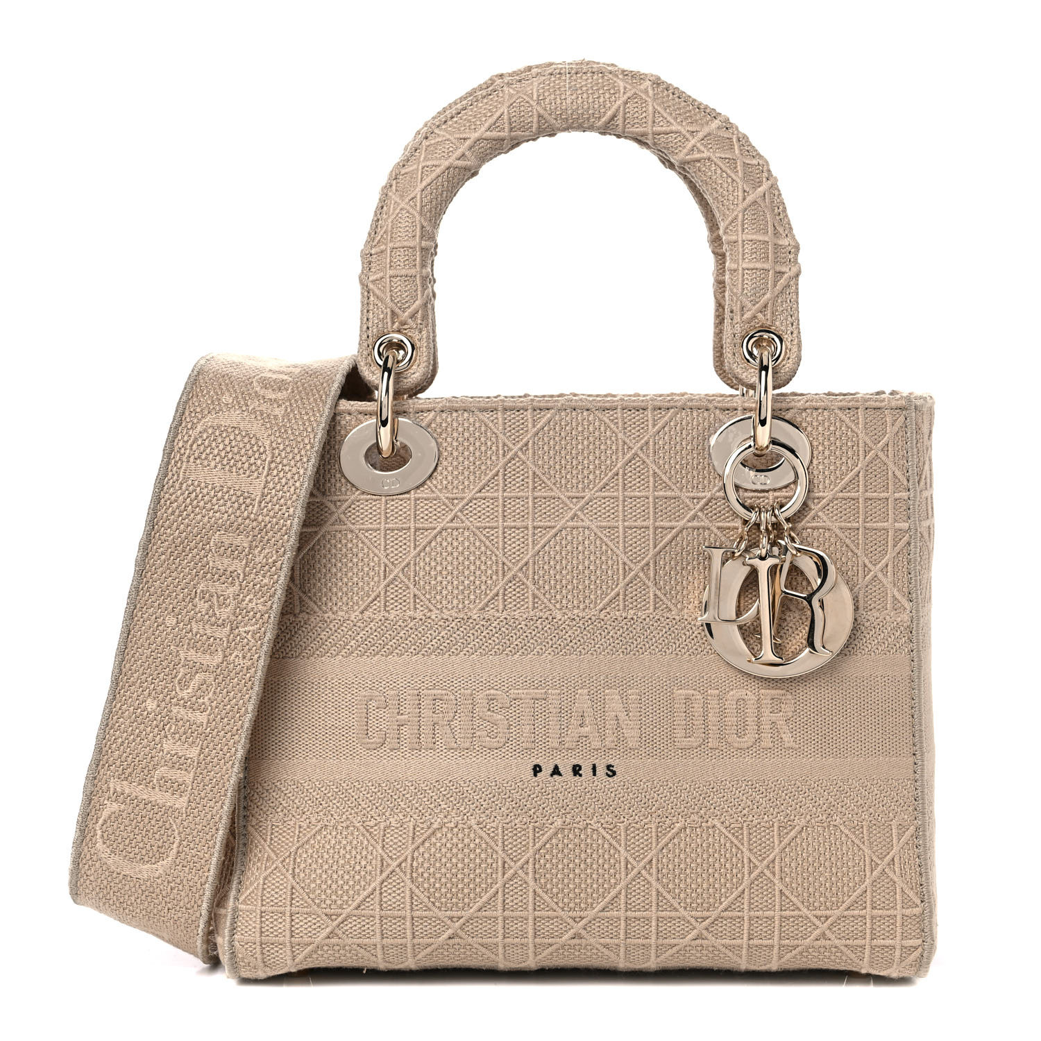 This is an authentic CHRISTIAN DIOR Canvas Embroidered Medium Lady D-Lite in Beige. This stylish handbag tote is finely crafted of embroidered beige Cannage canvas with a ‘Christian Dior’ signature on the front and features fabric top handles and shoulder strap with gold hardware, including a Dior letters gold charm. The top opens to a Dior fabric interior with a zipper pocket.