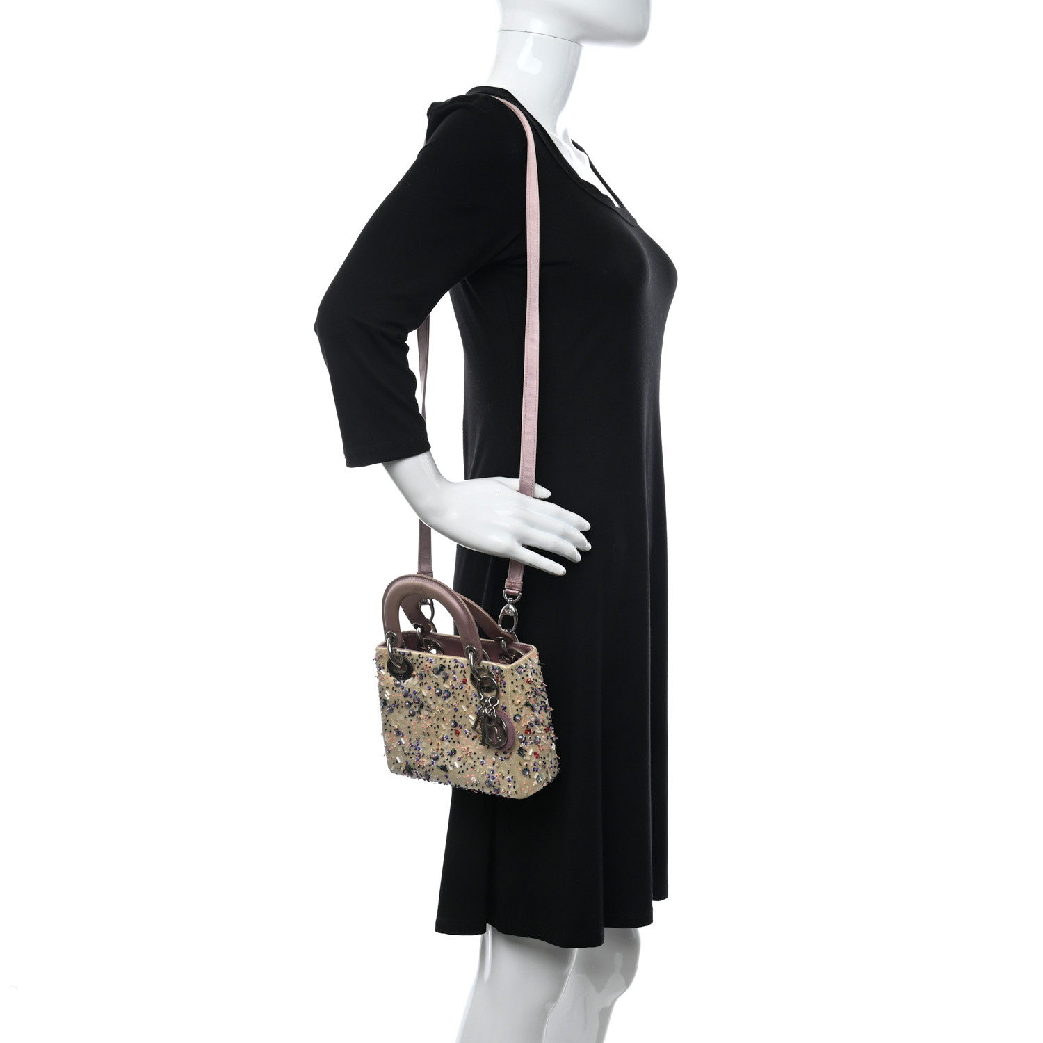 This is an authentic CHRISTIAN DIOR Satin Embroidered Beaded Mini Lady Dior in Pink and Multicolor. This stylish tote is crafted with a multicolored beaded embroidered scene throughout the entire bag. The bag features pink fabric top handles, an optional shoulder strap with polished silver hardware including wide eyelets and Dior letter charms. The top is open to a pink fabric interior with a zipper pocket.