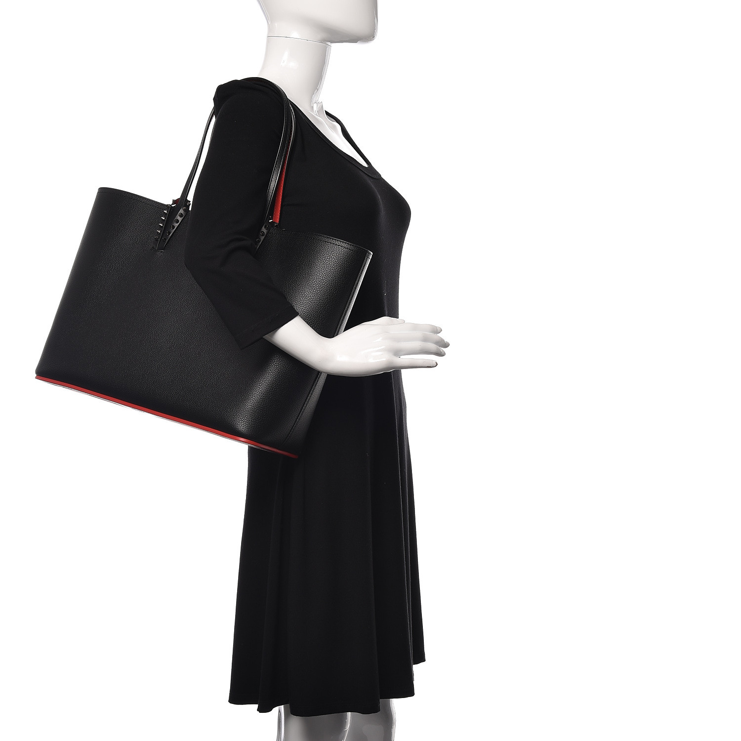 This is an authentic CHRISTIAN LOUBOUTIN Calfskin Loubinetic Spikes East West Cabata Tote in Black. This chic tote is crafted of grained leather in black. This shoulder bag features black leather strap handles with silver studs accents. The top opens to a red interior with a matching removable pouch.