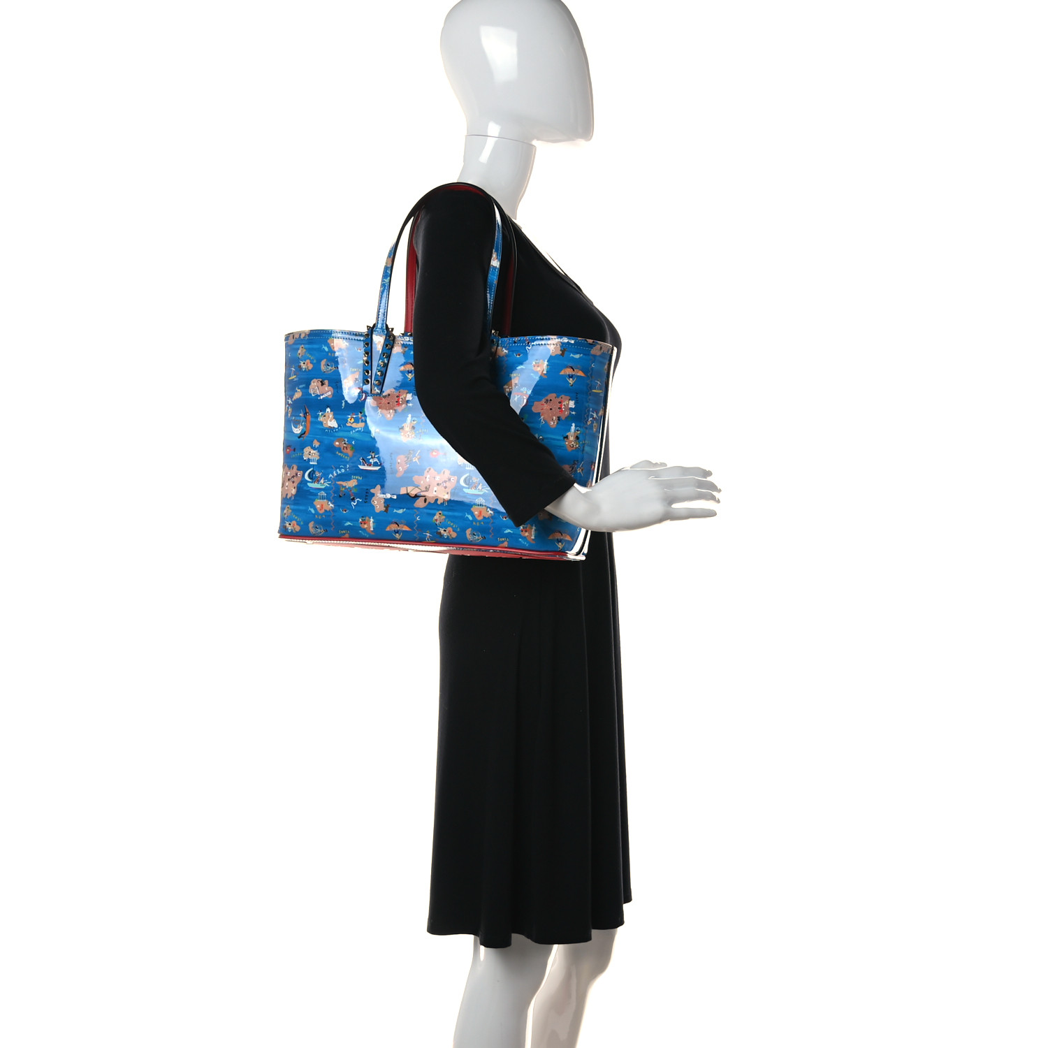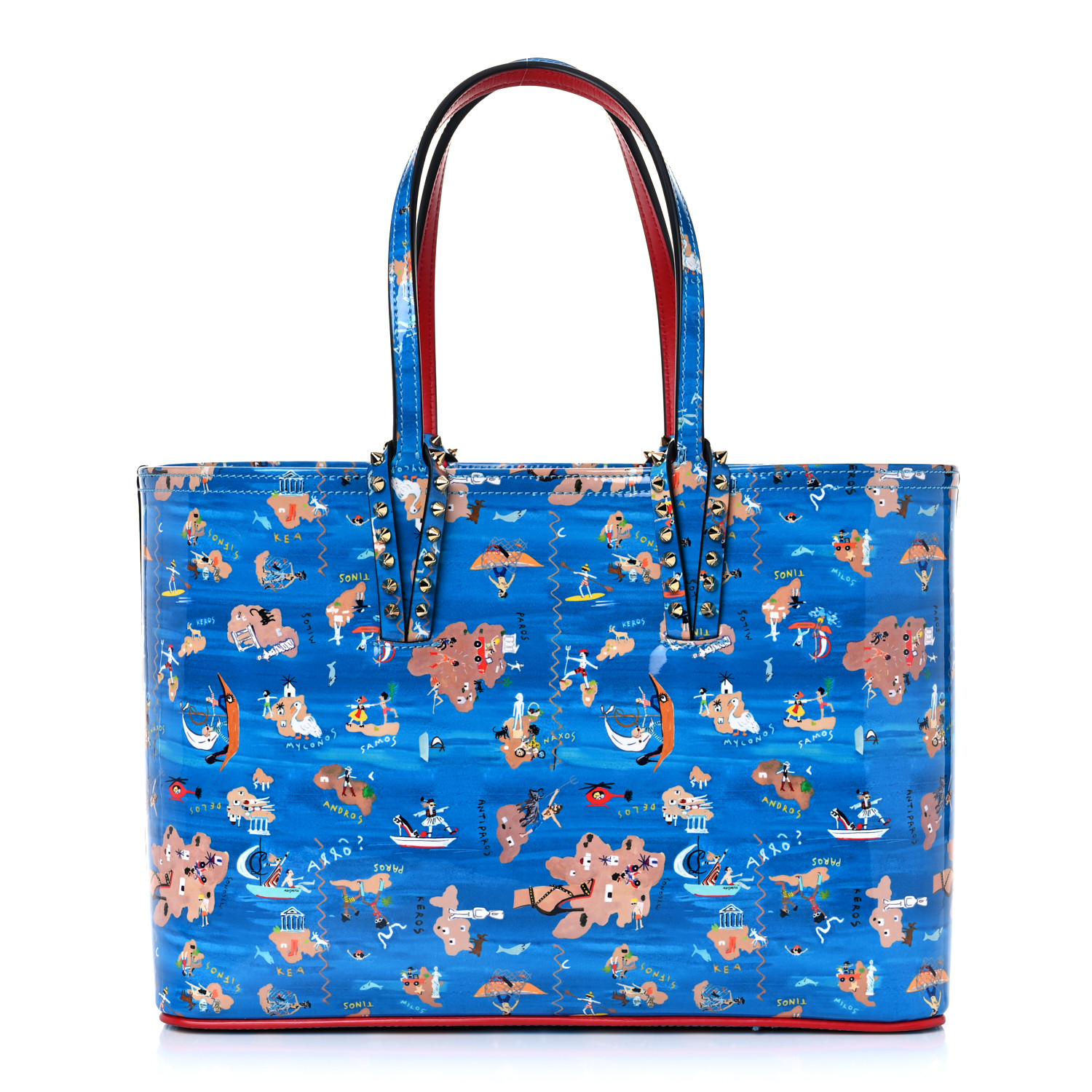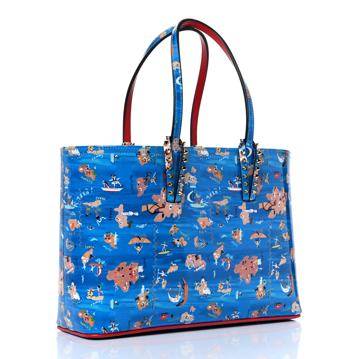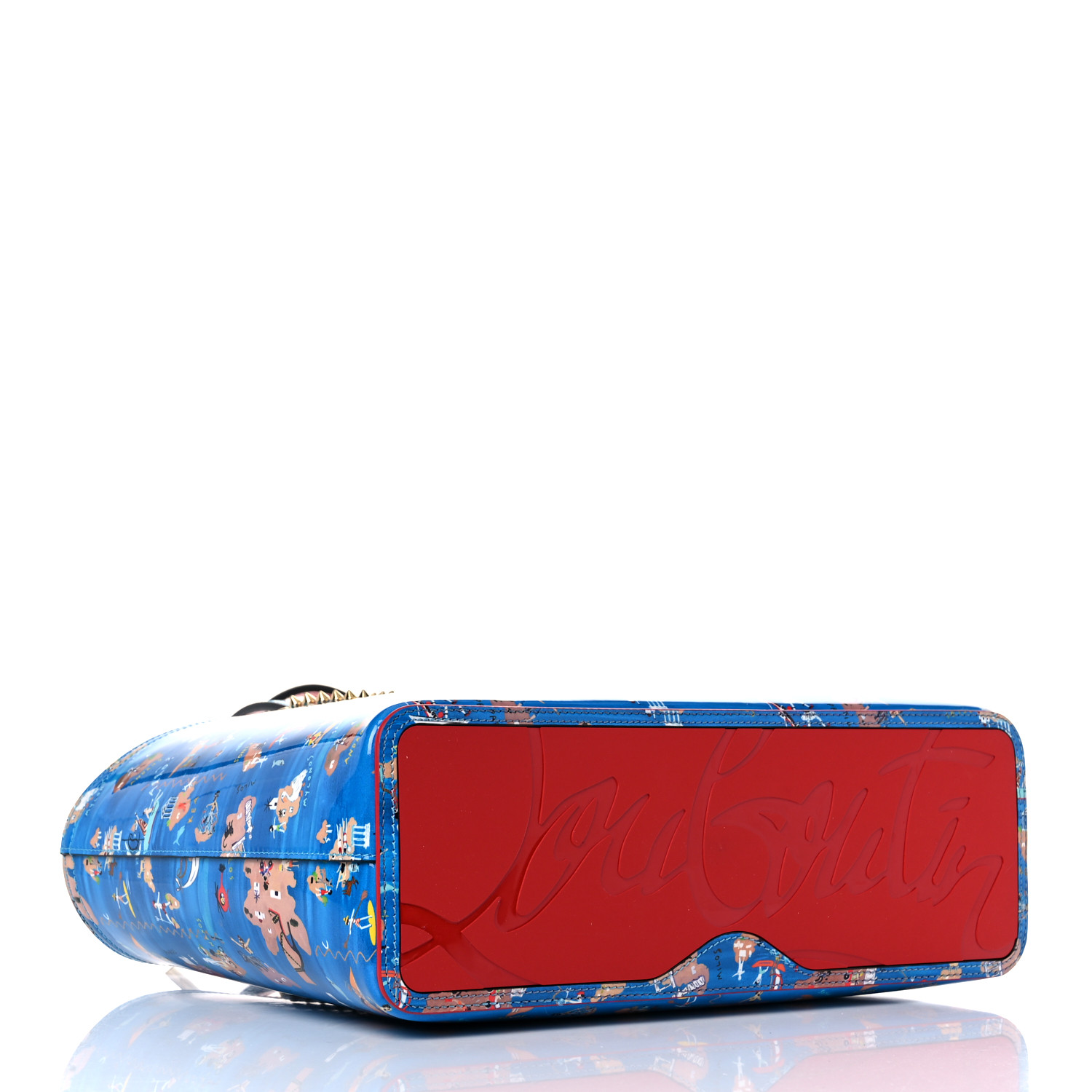 This is an authentic CHRISTIAN LOUBOUTIN Patent Calfskin Small Greekaba Cabata Tote in Blue. This chic tote is crafted of patent calfskin leather in blue with a multicolor design. The bag features leather strap handles with silver stud accents and Louboutin signature logo base. The top is open to a spacious multicolor print leather interior.