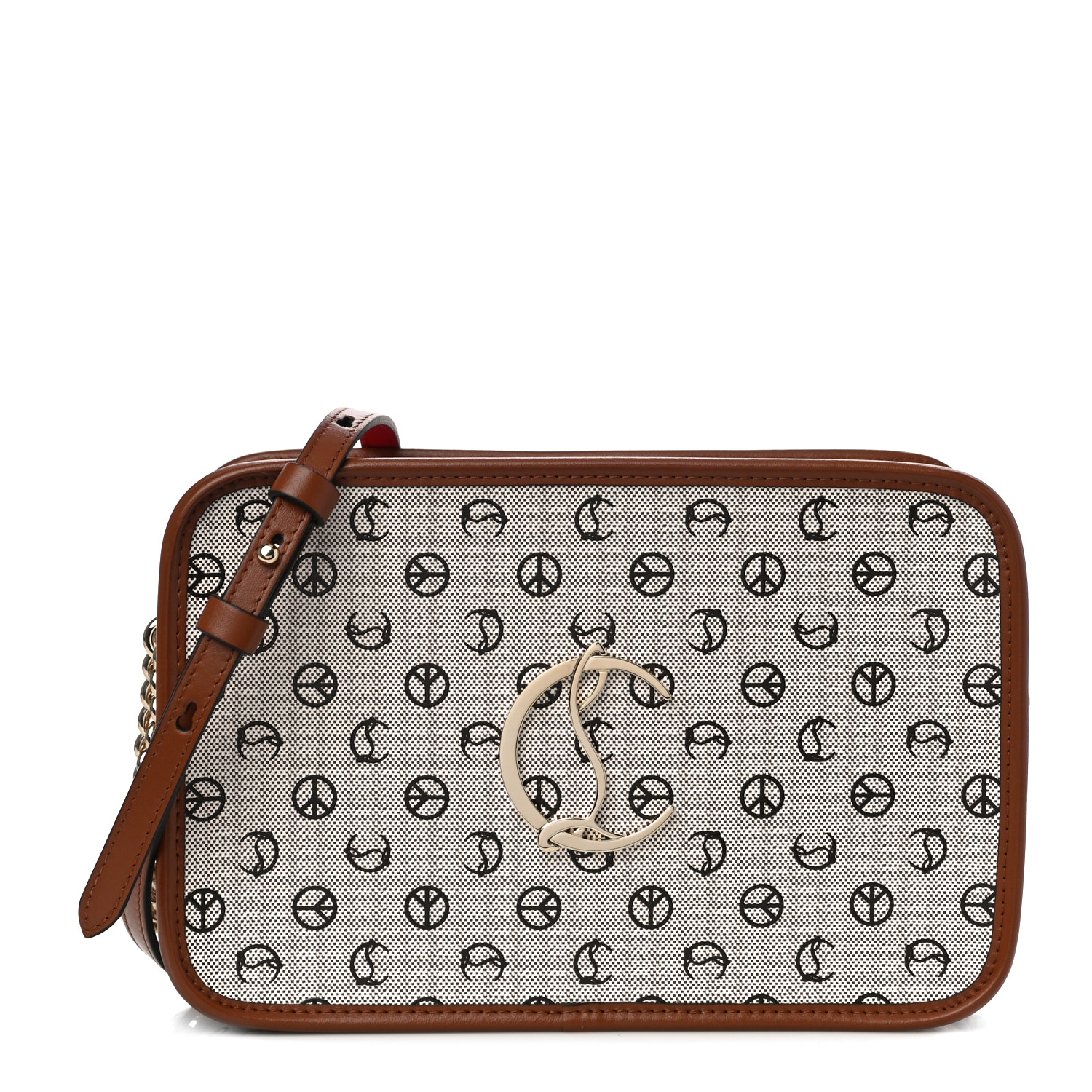 This is an authentic CHRISTIAN LOUBOUTIN Radioloubi Peace Toile Shoulder Bag in Cuoio. This chic cross-body bag is beautifully crafted of smooth brown Paris calfskin leather. The bag features a waist length gold chain strap. The zipper opens to a red leather interior with card slots.