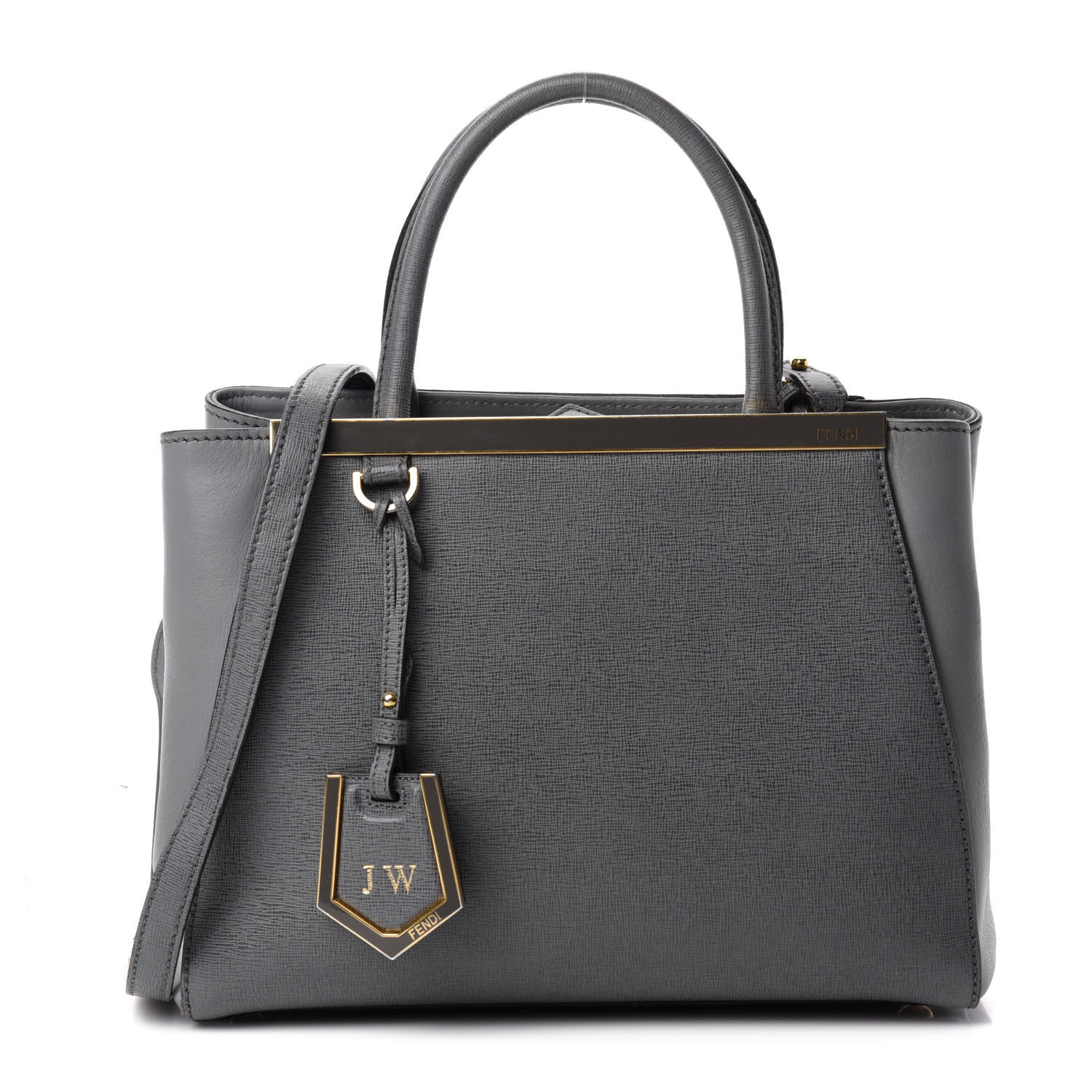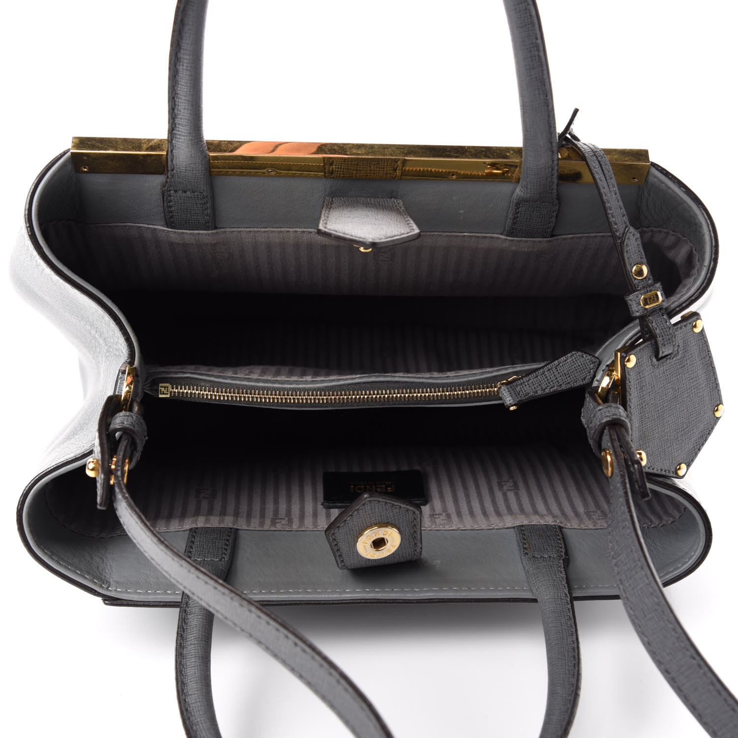 This is an authentic FENDI Vitello Elite Petite 2Jours Tote in Grigio. This stunning tote is crafted of multi-textured calfskin leathers in grey. The bag features rolled leather top handles, an optional shoulder strap and expansive sides with a gold top frame and a wide-open top. The top frame unsnaps to a partitioned grey fabric interior with a central zippered pocket.